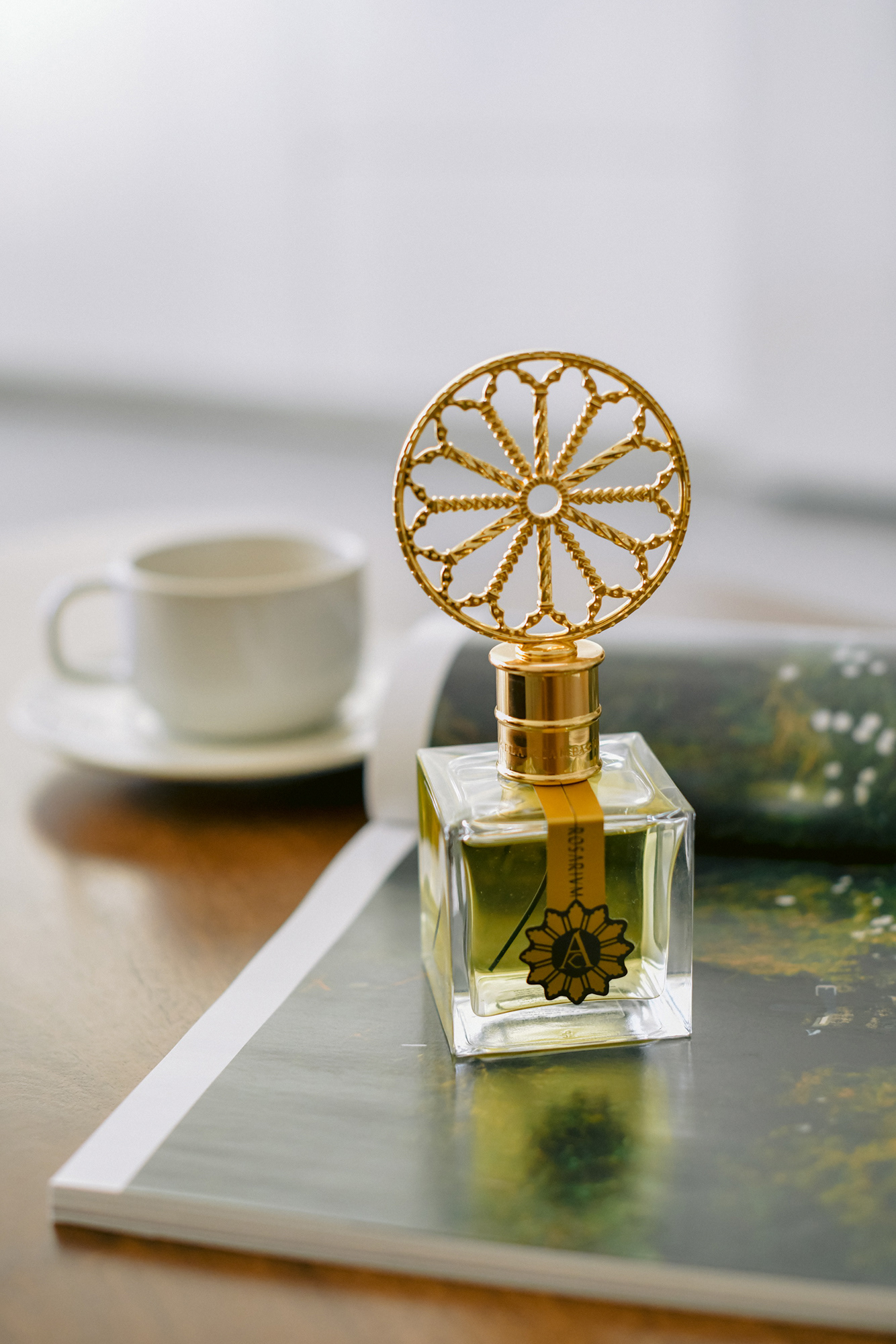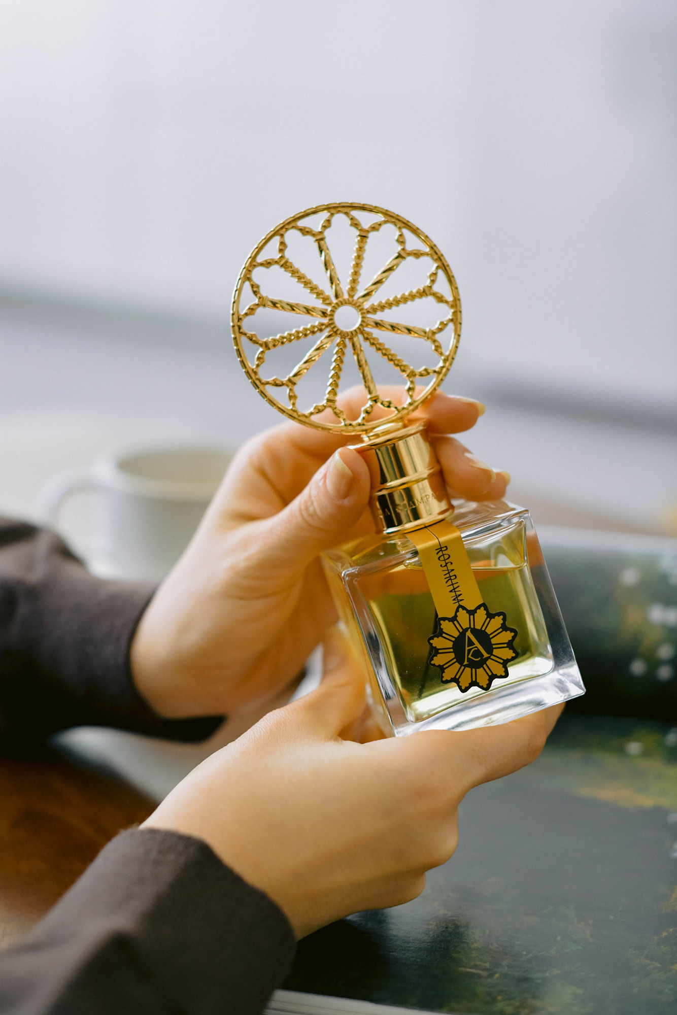 Ceea ce fascineaza prima data la sticlele de parfum ale Angelei Ciampagna este capacul sculptat in forma de rozeta, simbol inspirat din fereastra rozeta a Catedralei Altri.